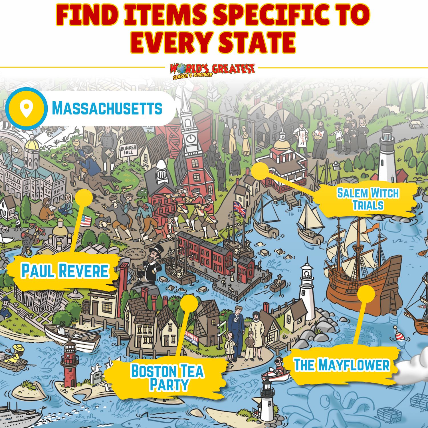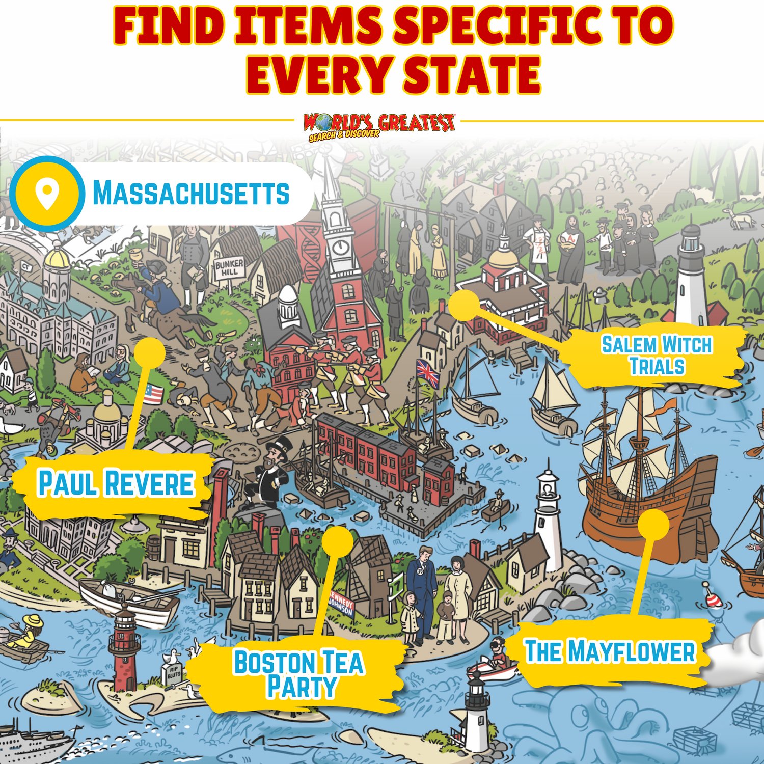 Spot iconic locations and history in every state! You can find things like the Grand Canyon in Arizona, Mount Rushmore in South Dakota, and the Liberty Bell in Pennsylvania, along with pivotal moments that shaped American history in every state.