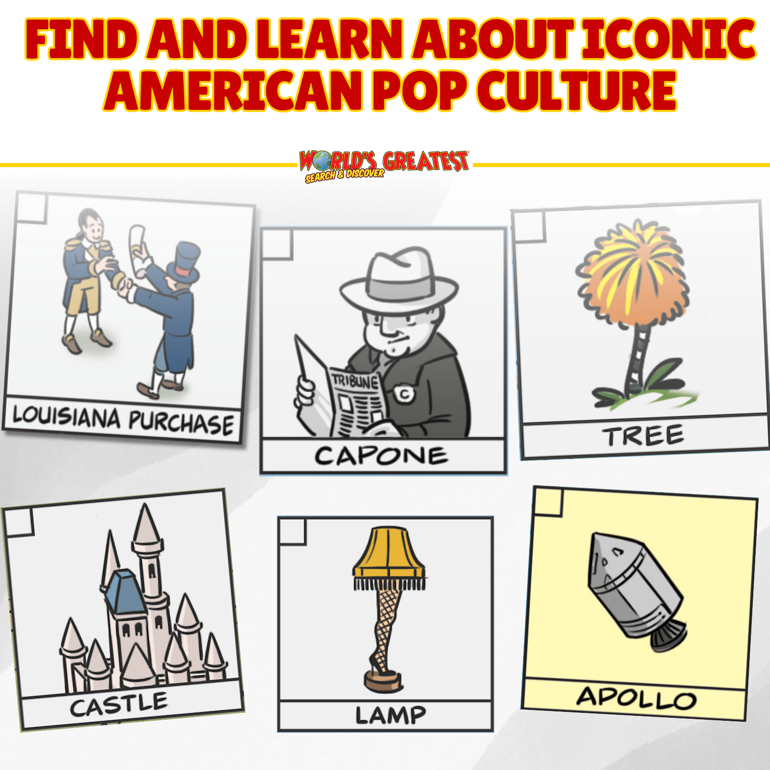 Step into the world of American pop culture, classic films, and legendary literature with this massive search-and-find poster! Spot famous landmarks from movies, legendary literary figures, and moments that shaped entertainment history.