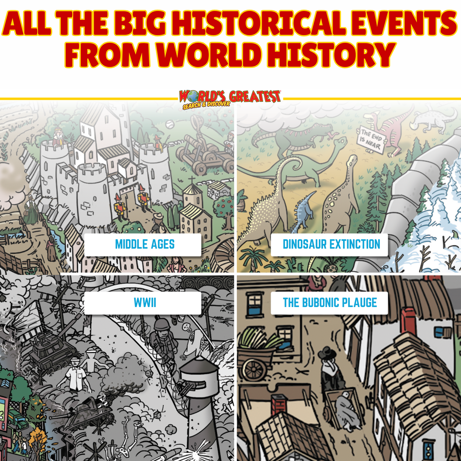 From the fall of Rome to World War II, this search-and-find timeline brings history’s most defining moments to life! Find and explore major events like the Black Plague, the Dark Ages, the Renaissance, the Industrial Revolution, and space exploration—all captured in incredible detail.