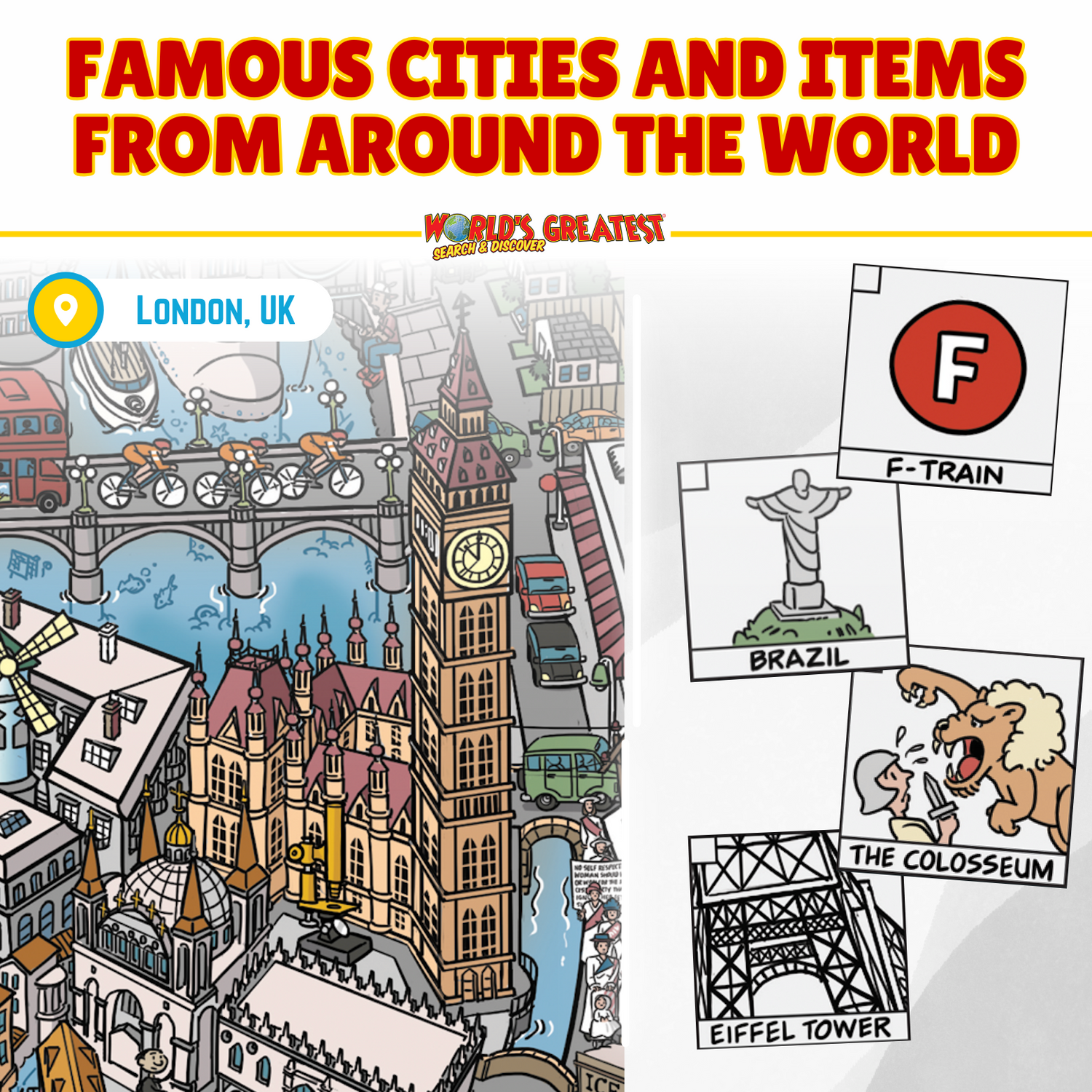 Travel the globe without leaving home! Spot New York City’s F Train, London’s iconic red buses, and explore world-famous landmarks like the Eiffel Tower in Paris and the Great Wall of China.