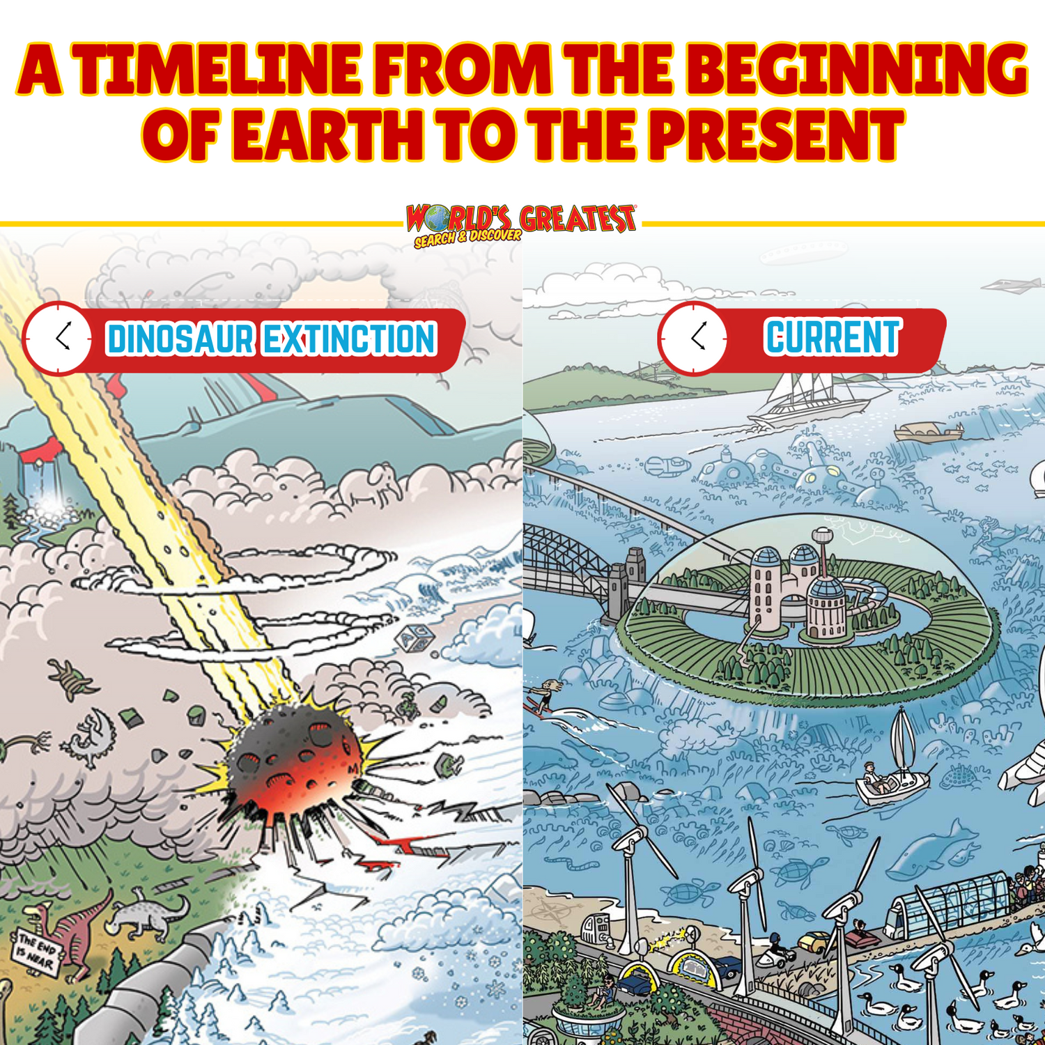Experience the entire story of our planet in one massive search-and-find timeline! Starting on the left, watch the world evolve—from the age of dinosaurs and their extinction to the Ice Age, followed by the rise of ancient civilizations like Egypt. As you move across the poster, you’ll see the progression of the Middle Ages, the Industrial Revolution, and major turning points in world history, leading all the way to the future on the right side.